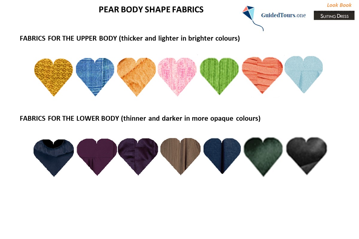 While choosing fabrics and patterns for the pear body shape, the main purpose is to achieve a balanced silhouette by enhancing the upper body and de-emphasizing the lower body. For this reason, thicker and lighter fabrics in bright colours for the top of the body, and thinner and darker fabrics in more opaque colours for the bottom of the body are recommended. Sweaters or jackets made of thicker fabrics such as tweed, flannel, fleece or wool are a great option for cold weather, because if you wear them with a pair of high-waisted denim jeans, they will nicely balance your top with you bottom. If the weather is warmer, you can choose a skirt or a pair of trousers made of very lightweight fabrics such as batiste or chiffon and a top or shirt made of cotton or linen. As you have generous hips, more