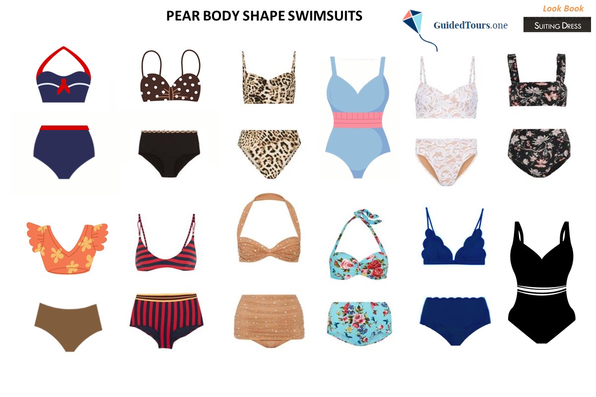 Two-piece swimsuits are more comfortable and flattering on the overall body proportions of pear-shaped women, because one-piece swimsuits are often too tight below or have halter necks, which create lines towards the inside of the bust, thus visually narrowing the shoulders. You can pair bottoms and bras of different colours and prints: for example, you can opt for a retro-style polka dot bra for your top and a single-colour brief for your bottom. The bottom can be smoother and darker if you don’t want to accentuate your curves.