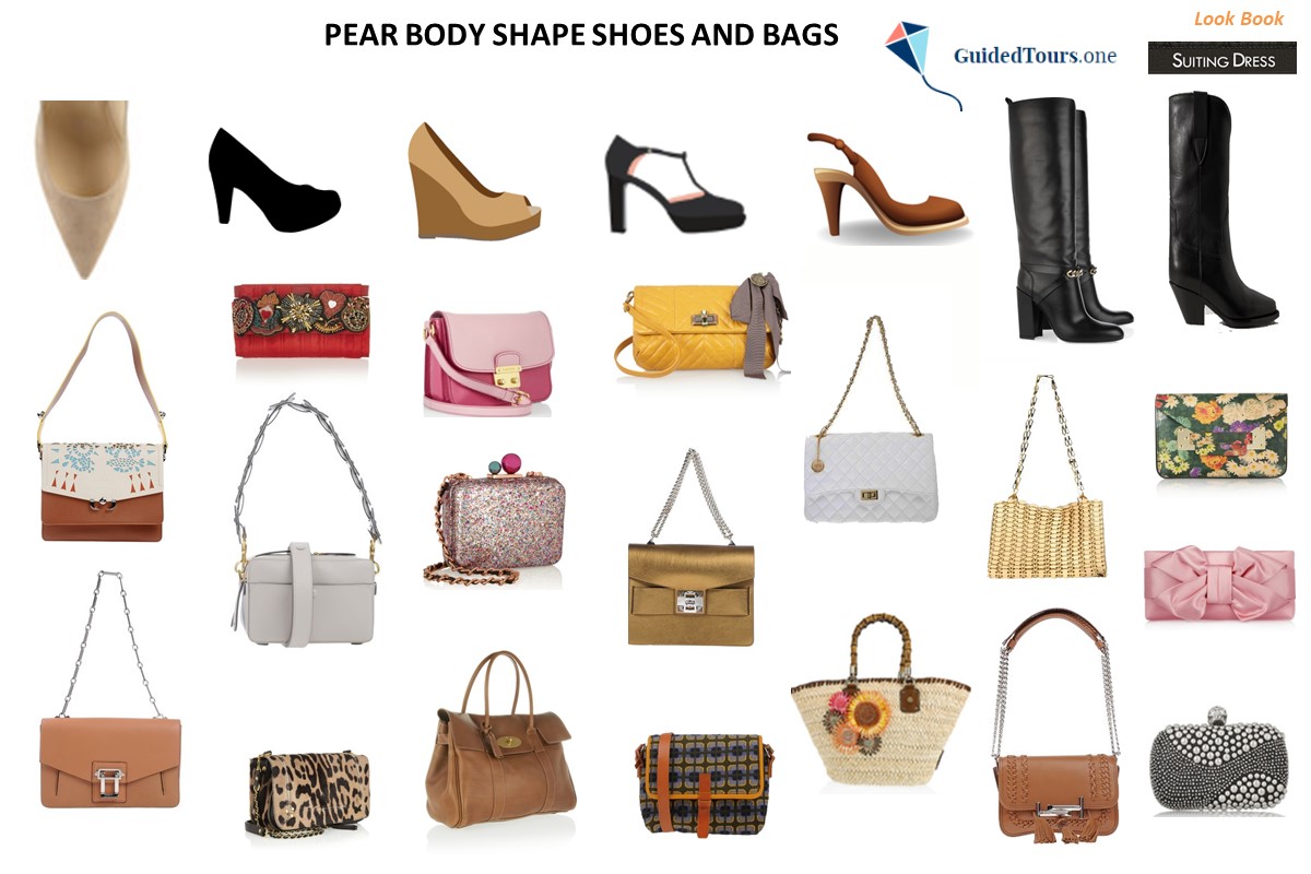 Regarding bags, pear-shaped women should opt for shoulder bags that have square, rectangle, oval or inverted trapezoid shapes and short straps. Wear the shoulder bags (small or medium) at the height of the bust ideally or not lower than the waistline, to draw attention upward and balance the volume of the bottom with the top. Overly long shoulder straps will even more verticalize the torso, which is often longer than the legs of pear-shaped women. Thus, by shortening the shoulder strap at the height of the bust, you will add volume to the top and balance the silhouette. Cross-body bags will visually elongate the torso, and those resting on the hips will add volume to the lower part of the figure. The clutch, as it is small and not very bulky, is worn under the arm or carried in the hand at waist level. The goal is not to accentuate the hips.