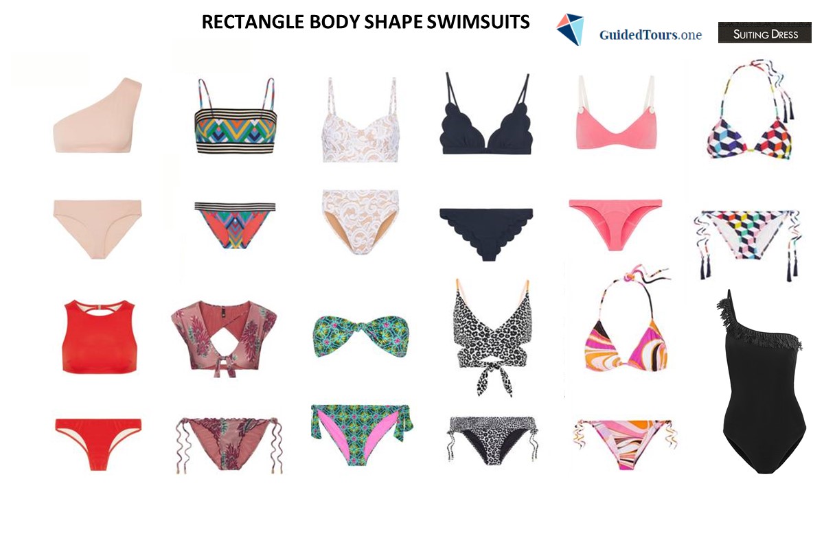 Rectangle silhouettes look great with both one-piece and two-piece swimsuits: their structure lends itself perfectly to diagonal cuts and asymmetrical one-shoulder styles, but also sportier styles. Bandeau or tube bikini tops draw the eye towards your bust and make other parts of your silhouette less noticeable, while wrap swimsuits create the curves and enhance a more feminine silhouette. One-piece swimsuits with cut-out sides (monokini) or colour blocking perfectly contour the torso, creating a very feminine shaping effect and can bring the illusion of an hourglass shape to the straightest of rectangles.