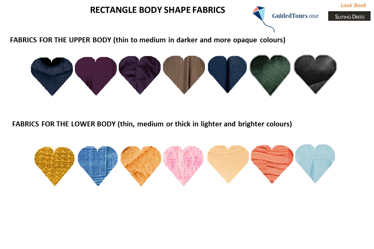 Since the rectangle shape is typically slim and slender, but with a little to no waist definition, the fabrics for the top are thin to medium in weight and smooth in appearance. Tops in fluid fabrics, in darker colours slim the waistline. Avoid thick or tight fabrics and shiny colours for the top, which accentuate the flaws and imperfections of the figure.