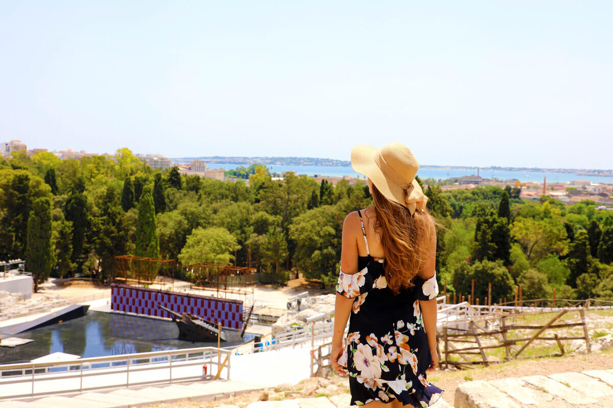 To capture impressive views from the Greek Theatre of Syracuse, head to the highest seating levels that offer the best point for sweeping vistas and scale panoramic views. From the top you can see the vast stone seating, the orchestra, and the stunning backdrop of the Sicilian landscape and sea. Wear an elegant dress and a wider-brim straw hat that will add a stylish flair to your more outfit and protect you from the hot sun in the summer.